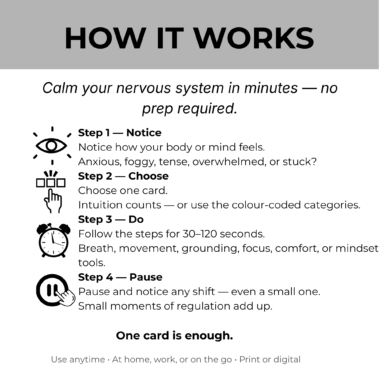 $14.9036 psychologist-designed regulation cards for anxiety, overwhelm, burnout, and stress. Somatic + cognitive tools you can use in under 5 minutes. Instant PDF + PNG download.