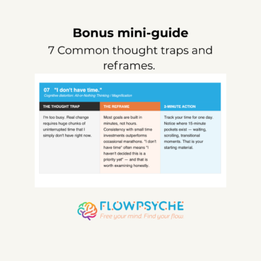 A psychology-backed goal setting workbook with audio guide, printable trackers, and a bonus Thought Traps mini-guide. Instant download.
